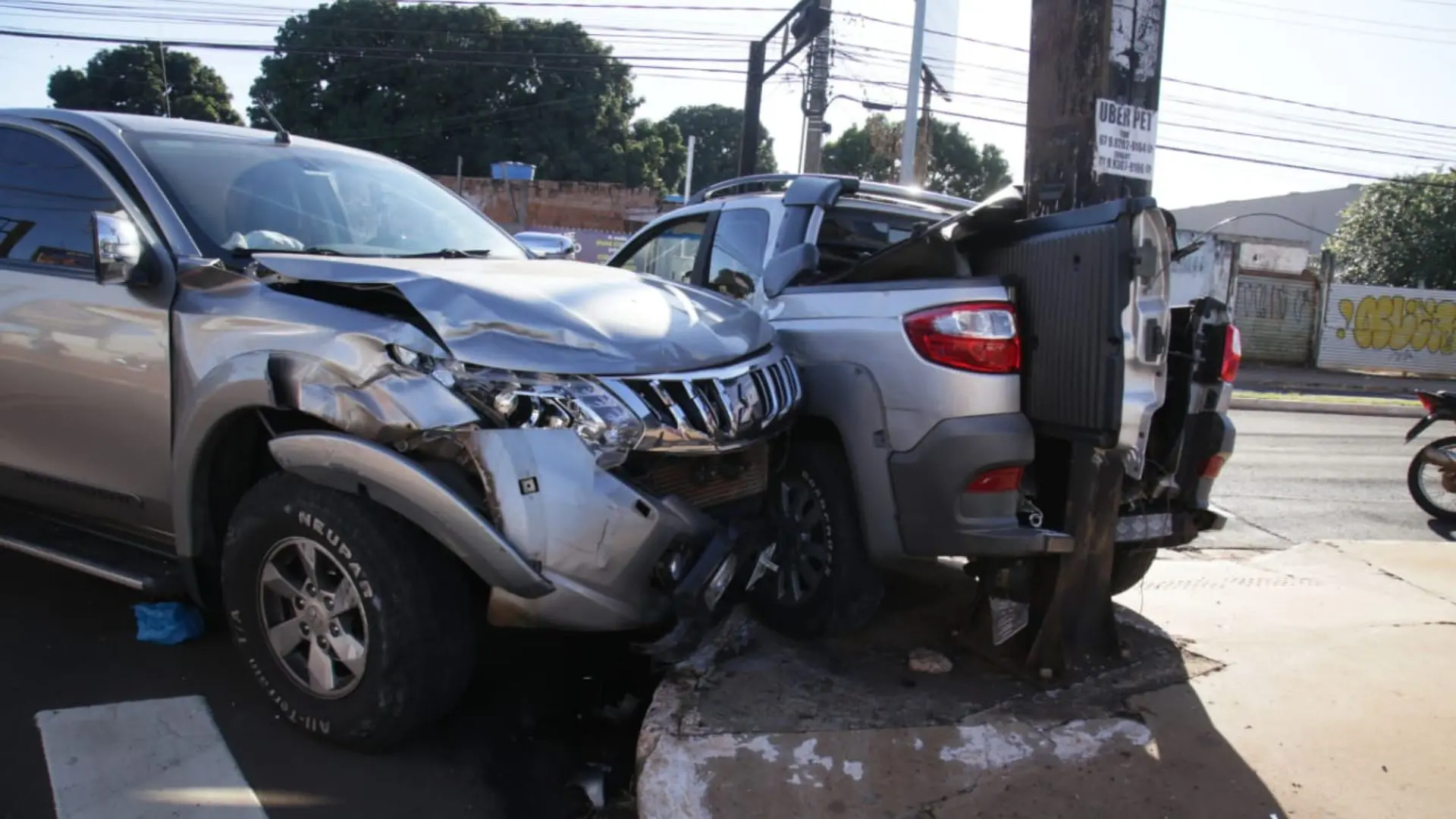 Um acidente envolvendo duas caminhonetes – uma Fiat Strada e uma Mitsubishi Triton – no cruzamento das avenidas Júlio de Castilho e Presidente Vargas, assustou motoristas que passavam pelo local, na manhã deste domingo (4). O impacto da colisão foi tão forte que chegou a destruir parte dos carros.
