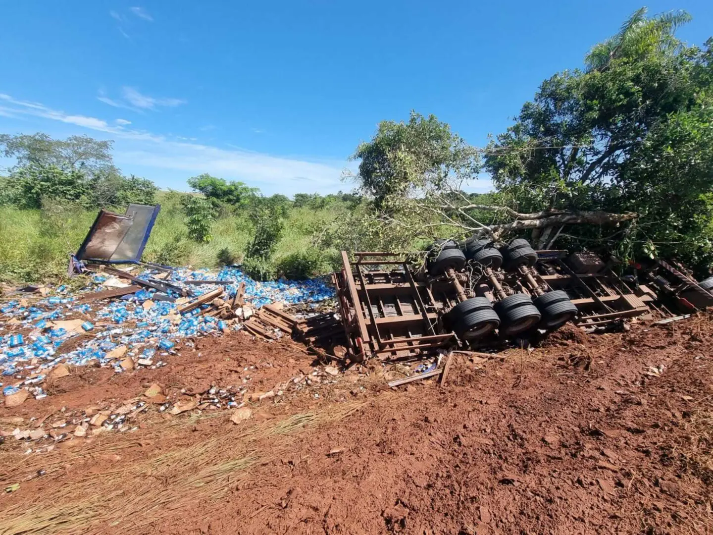 Uma carreta carregada com carga milionária de cerveja capotou no final da manhã desta quarta-feira (19), na MS-040, em Campo Grande. O veículo foi parar às margens de um córrego localizado na rodovia.