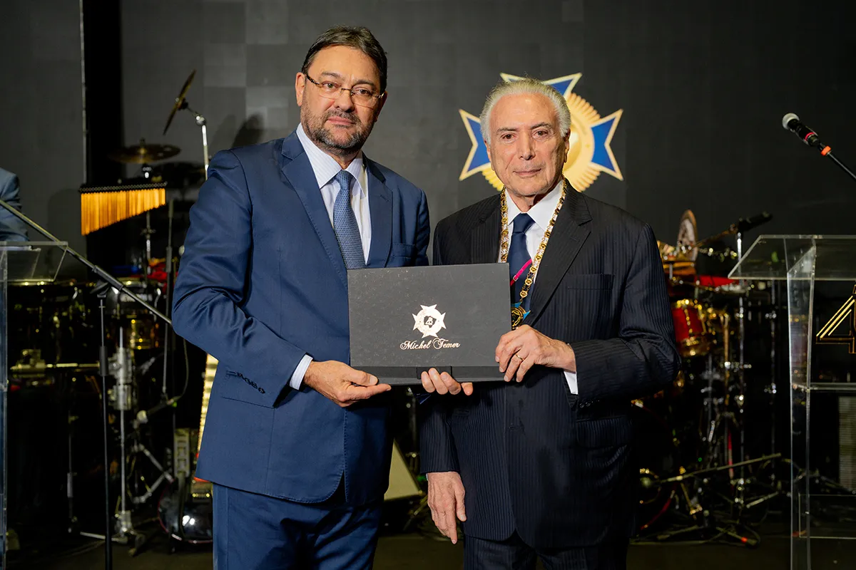 Principal homenageado do evento, Temer presidiu o país de 2016 a 2018 e agradeceu a condecoração. “É uma honra receber um prêmio da indústria de Mato Grosso do Sul, no momento em que ela aniversaria. São 45 anos de existência da Fiems. Isso, a mim, me revela como uma espécie de reconhecimento do nosso governo. Nós fomos capazes, em dois anos e meio, de fazer reformas fundamentais que naturalmente melhoraram não só a relação trabalhador e empregador, como melhorou enormemente a questão da indústria do país, entre tantos outros setores. Recebo esse título como reconhecimento ao meu governo”.