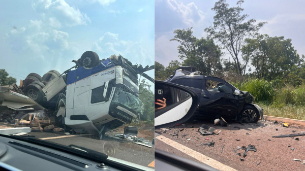 A carga foi despejada na pista. Devido ao acidente, houve congestionamento e ordenamento de trânsito da forma “pare-e-siga”. O Onix ficou destruído.