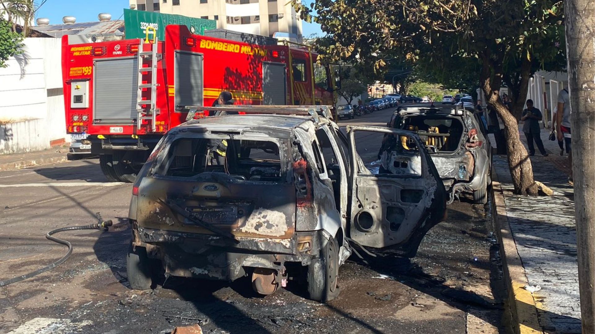 Um veículo modelo Ford Fiesta ficou completamente destruído na tarde desta segunda-feira (26), após pegar fogo na rua Arthur Jorge, esquina com a avenida Afonso Pena. As chamas ainda atingiram um Fiat Mobi que estava estacionado e ficou parcialmente destruído.